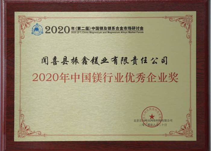 2020年中國鎂行業(yè)優(yōu)秀企業(yè)獎