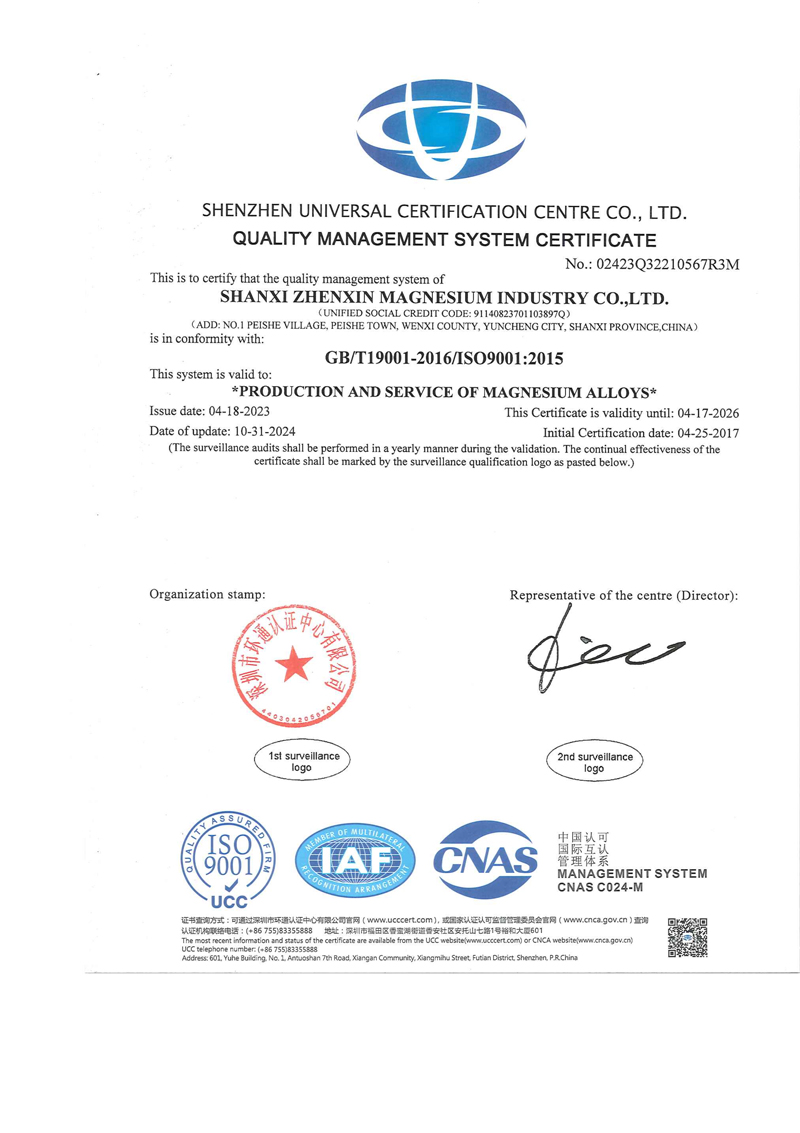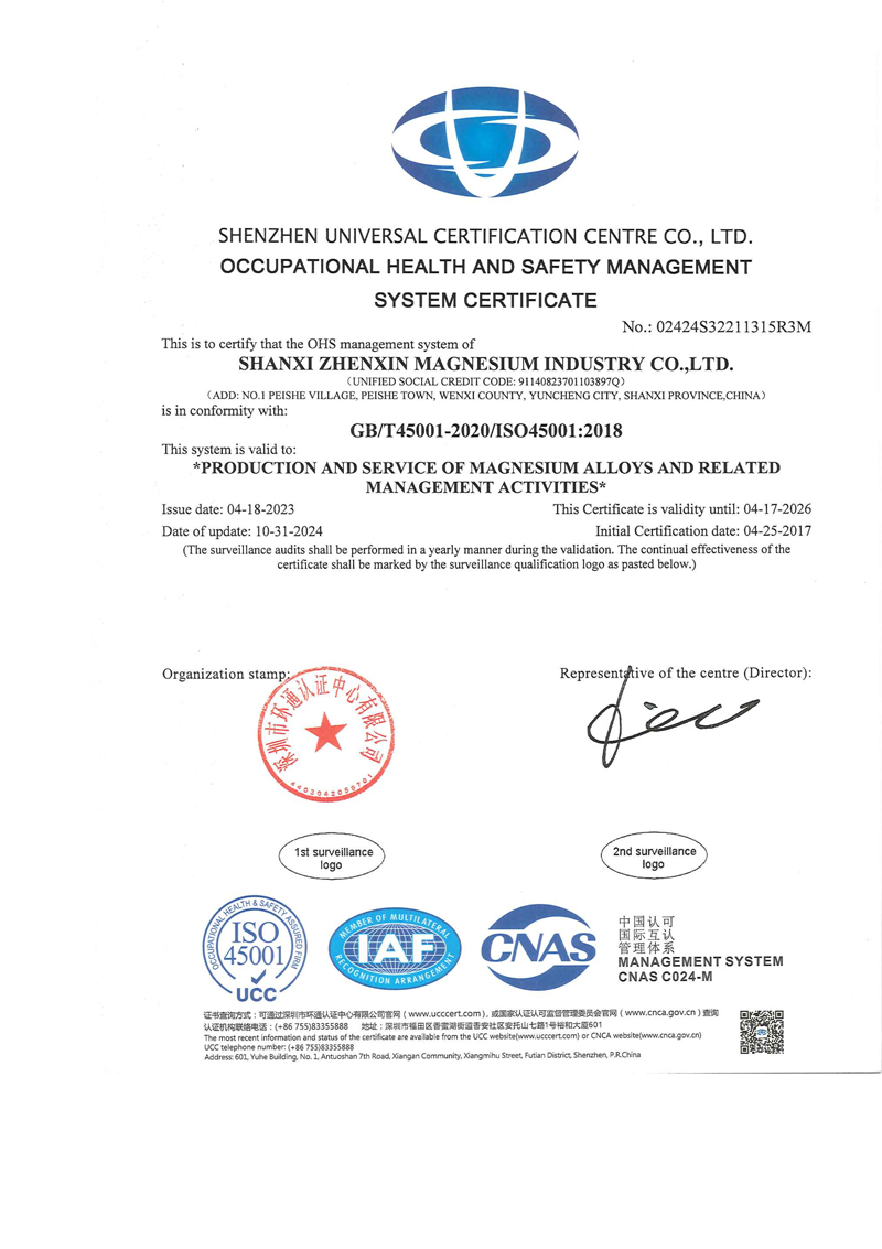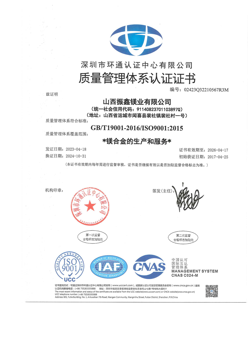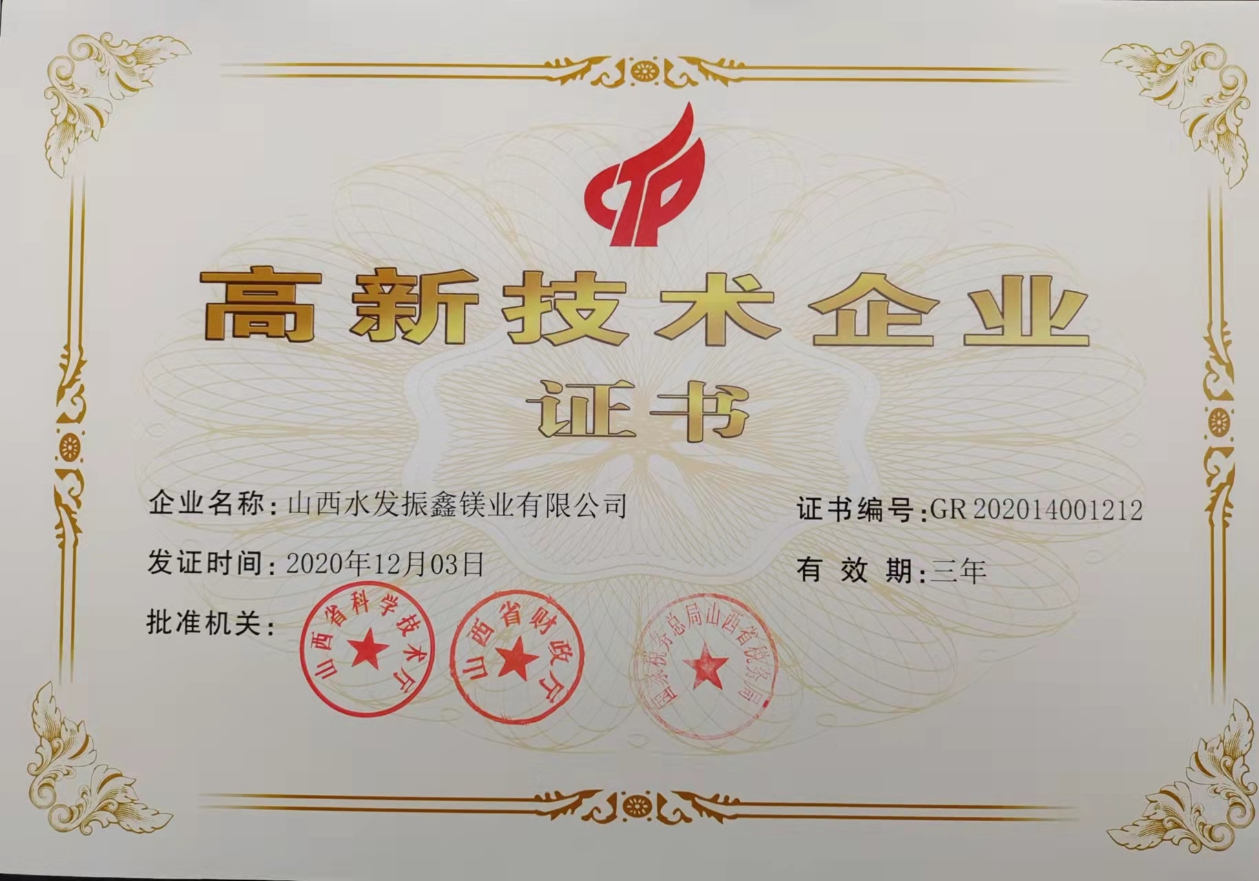 2020年,公司被認定為“高新技術(shù)企業(yè)”和“省級企業(yè)技術(shù)中心”,擁有多項專利。先后通過了ISO9001質(zhì)量管理體系、ISO45001職業(yè)健康安全管理體系、ISO14001環(huán)境管理體系和IATF16949汽車行業(yè)生產(chǎn)件與相關(guān)服務(wù)件標準、兩化融合管理體系等認證,取得了軍工生產(chǎn)資質(zhì)。是中國有色金屬協(xié)會認定為“AAA級信用企業(yè)”,是中國鎂協(xié)會“理事單位”,并獲得山西省“專精特新小巨人”、“節(jié)能減排先進企業(yè)”等榮譽稱號。